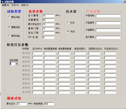 有:耐压试验、爆破试验、疲劳试验。可根据要设置的试验项目分别设置