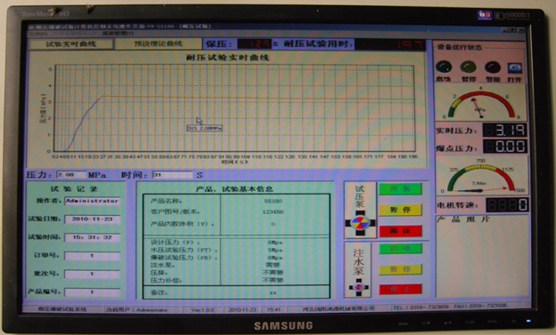 本系统内置本公司自主研发的专用控制软件,操作界面人性化,软件性能成熟稳定无缺陷,可以任意设定试验项目、压力值、保压时间等各种试验参数。完善的人机交互界面,制定试压方案后会通过弹出窗口的形式引导操作员完成实验。通过对话框上“确定”,“取消”按钮对相对危险(例如爆破实验)的试验项目,让程序员进行确认,确定实验的准确与安全。软件可根据用户技术要求更改功能,可按照用户自定义界面及功能编制,以双方最终沟通需方认可的界面为准。